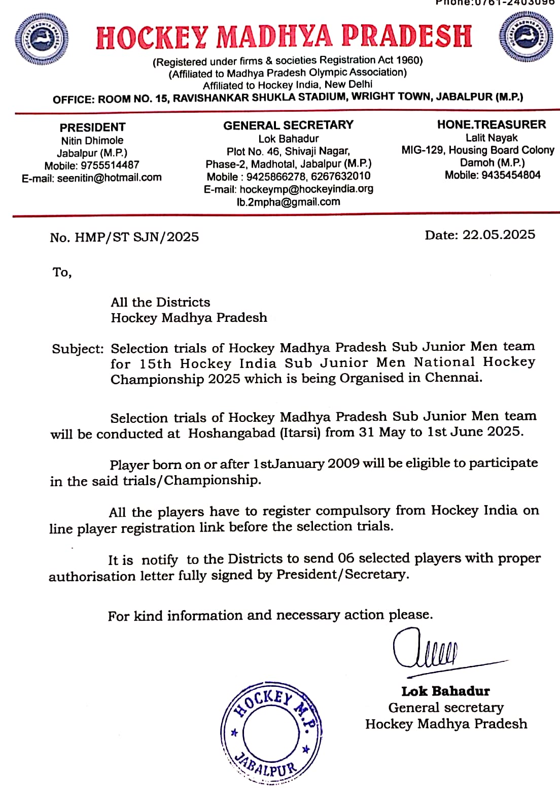 Sub Junior Men Hockey MP team selection and Coaching Camp 2021