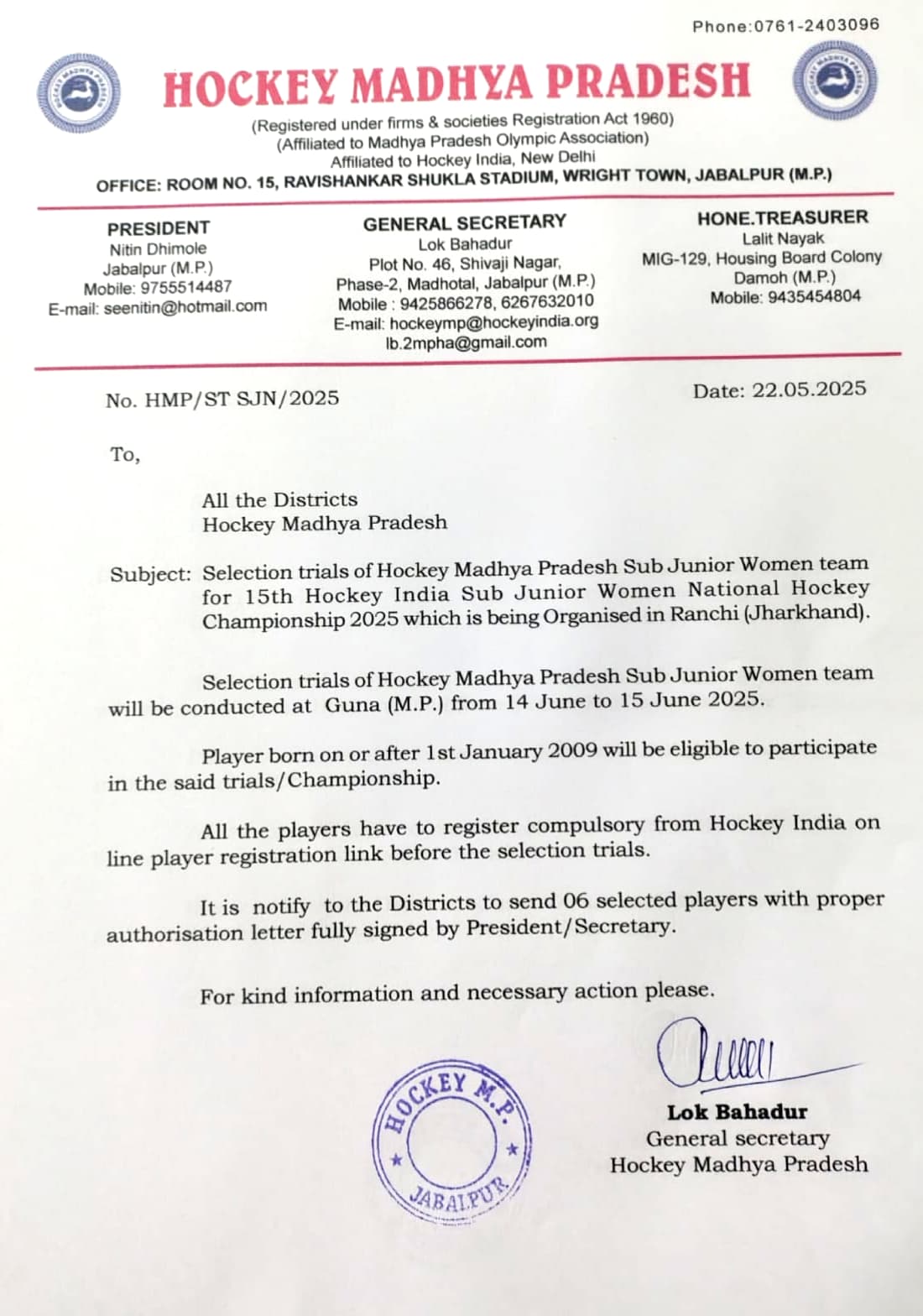 Selection trials of Junior Men Hockey Madhya Pradesh team in Betul(M.P) from 19/9/2021 to 21/9/2021