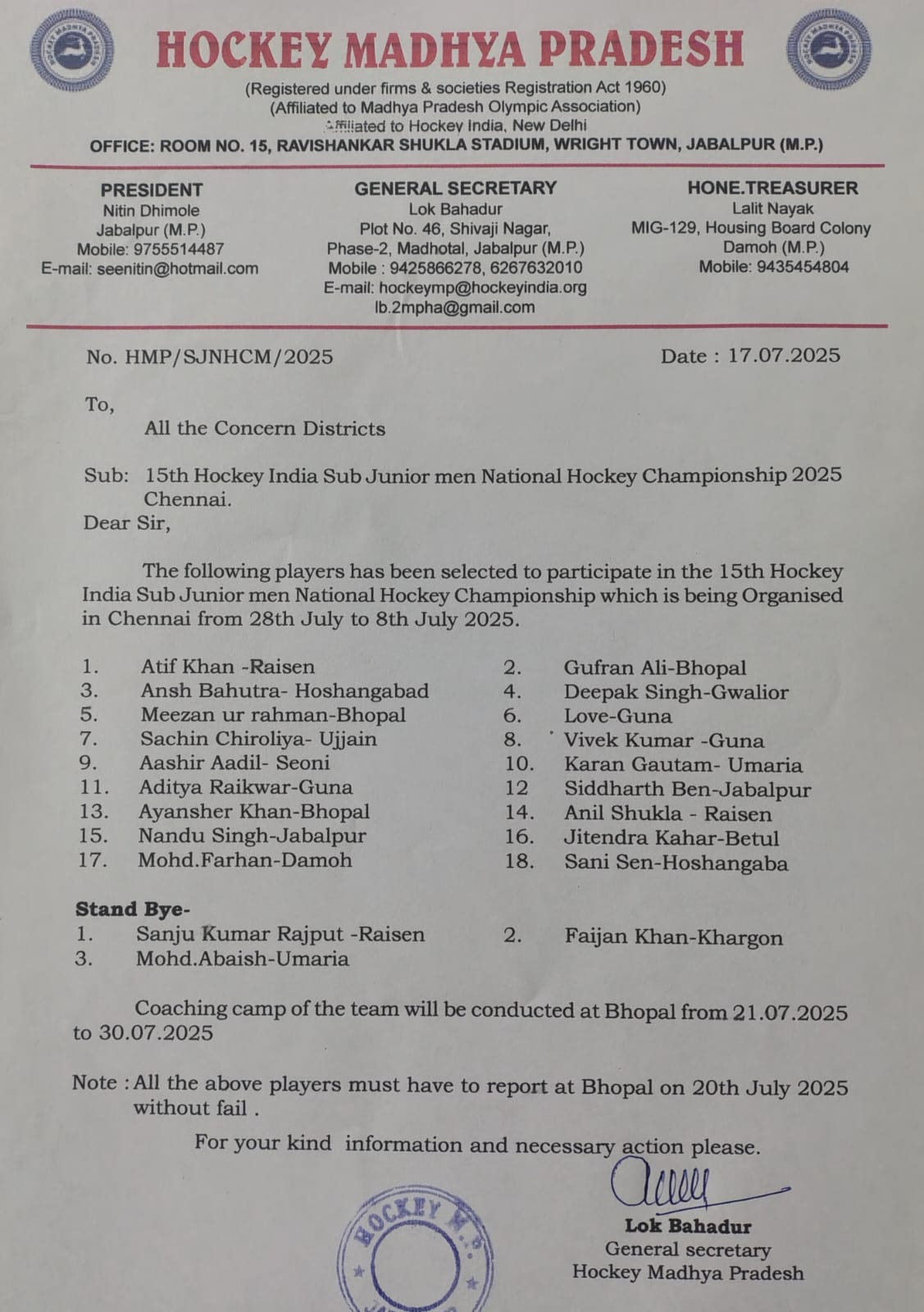 Coaching camp and final selection will be conducted on due course as per the National schedule of Junior Men National championship.