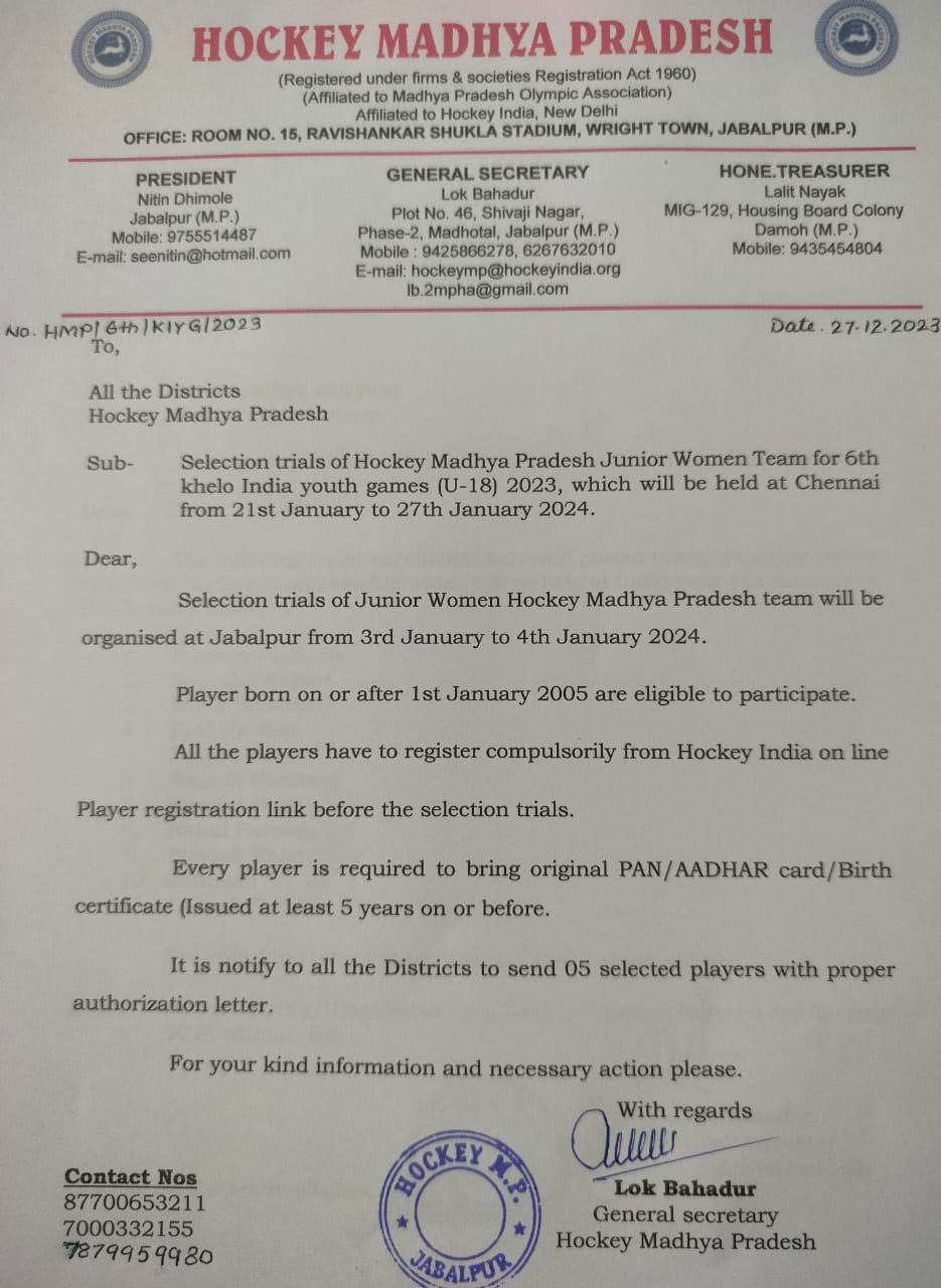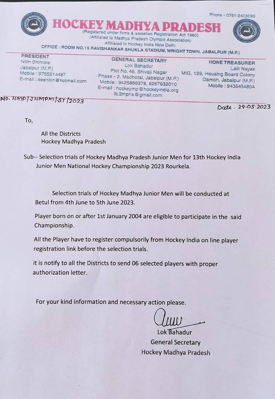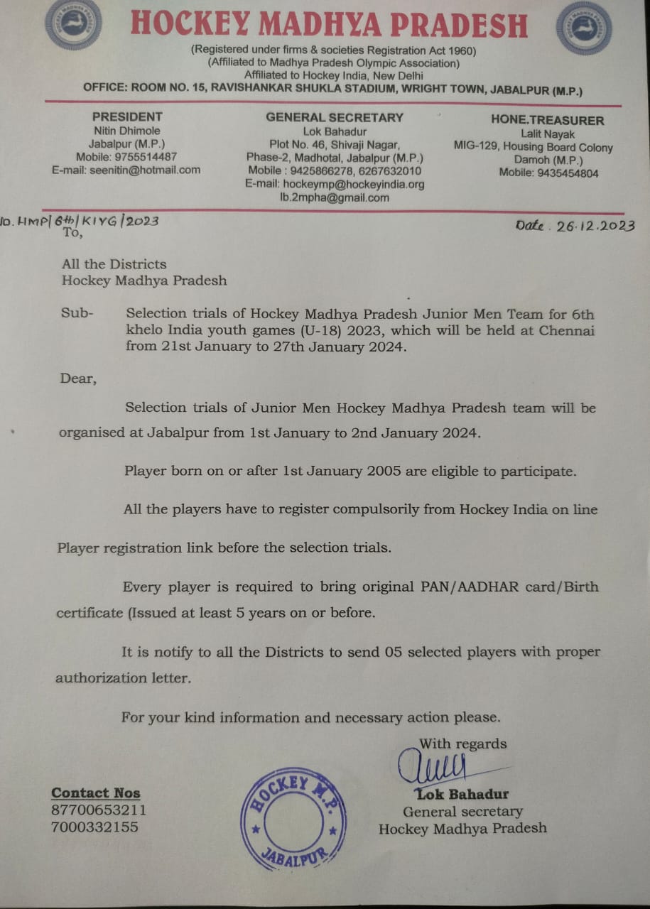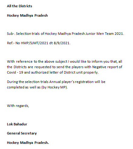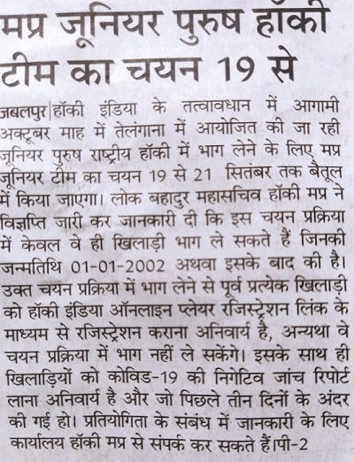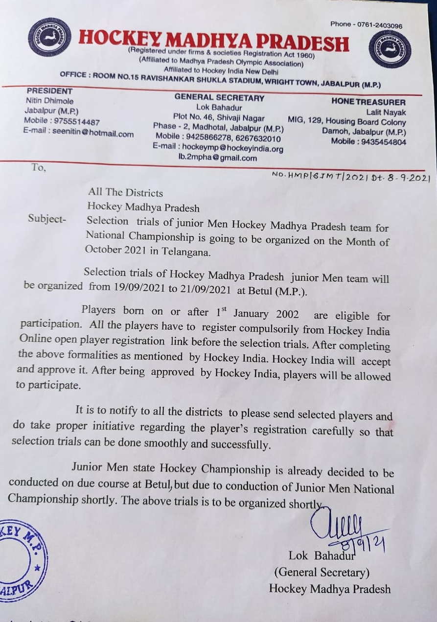 Selection trials of Junior Men Hockey Madhya Pradesh team in Betul(M.P) from 19/9/2021 to 21/9/2021