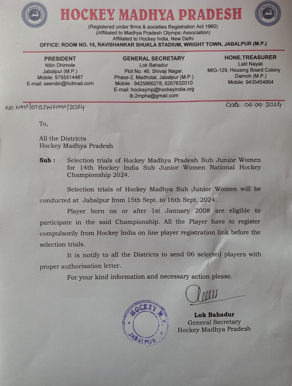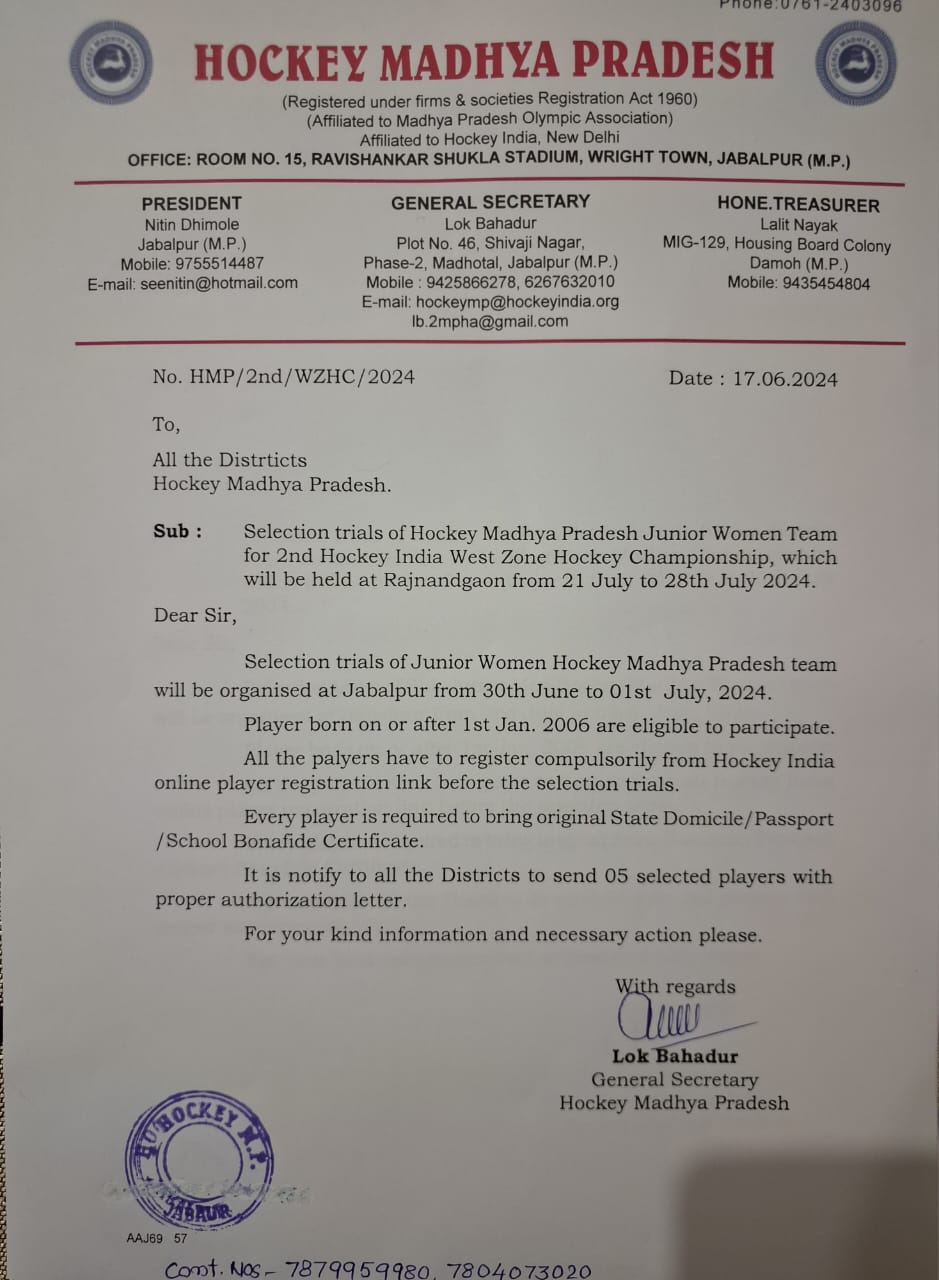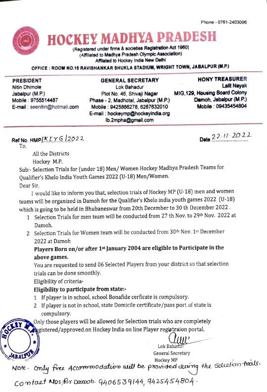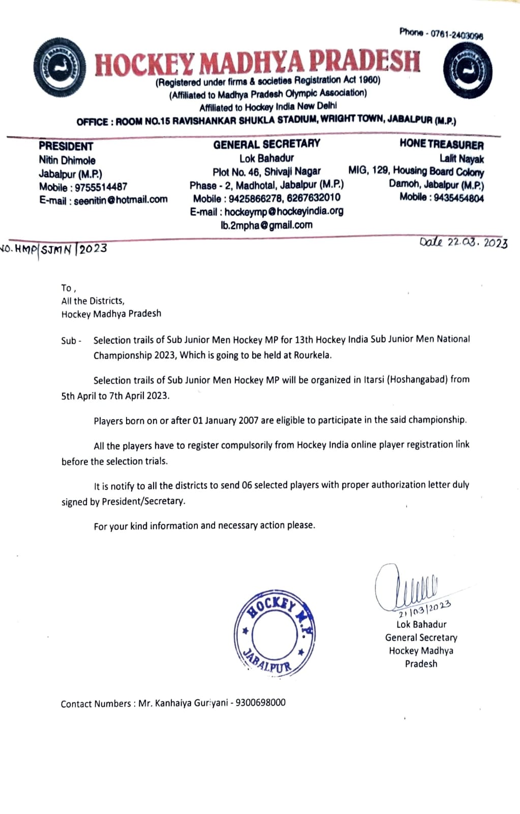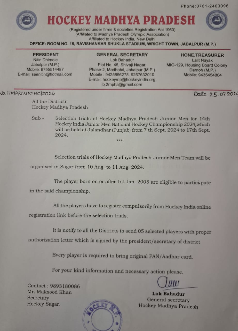 Selection trials of Junior Men Hockey Madhya Pradesh team in Betul(M.P) from 19/9/2021 to 21/9/2021