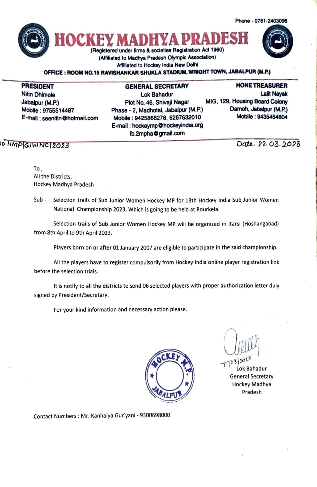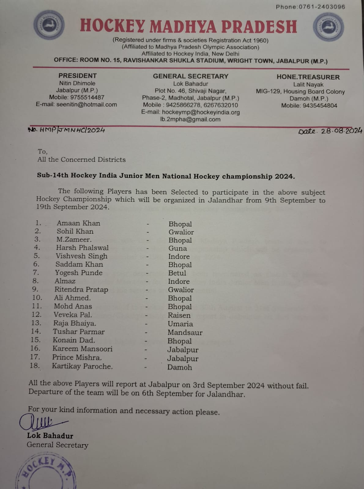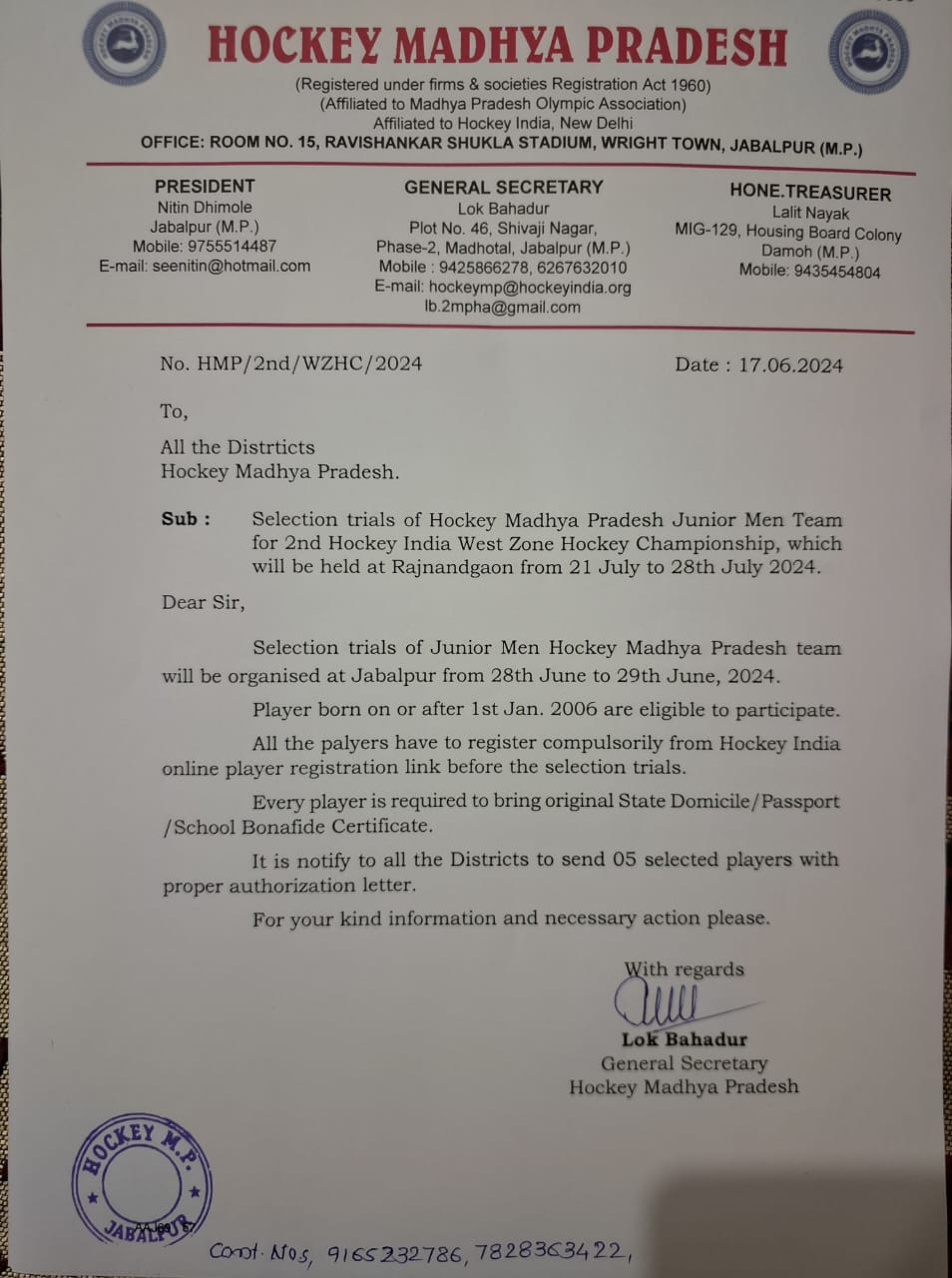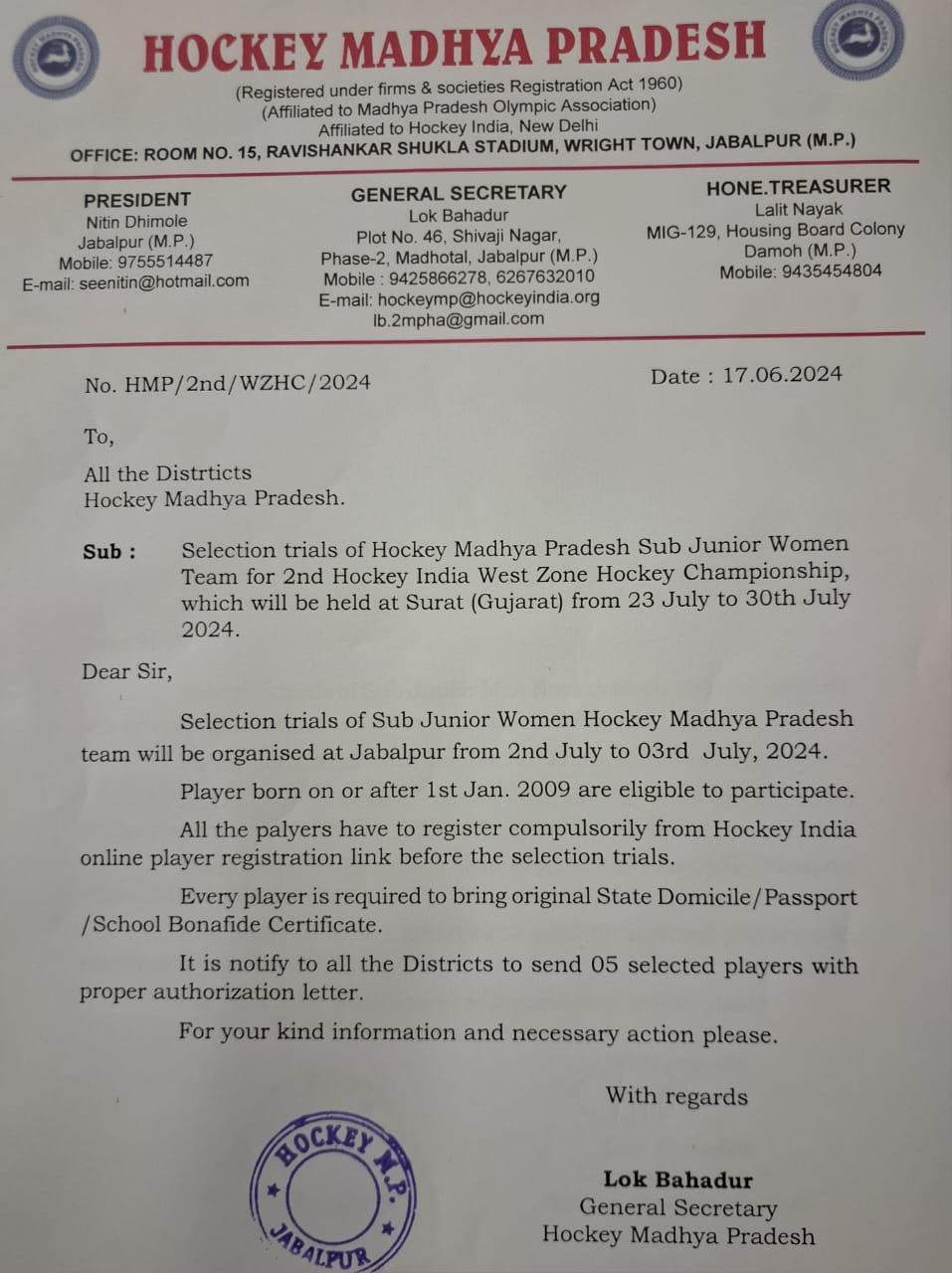 Selection trials of Junior Men Hockey Madhya Pradesh team in Betul(M.P) from 19/9/2021 to 21/9/2021