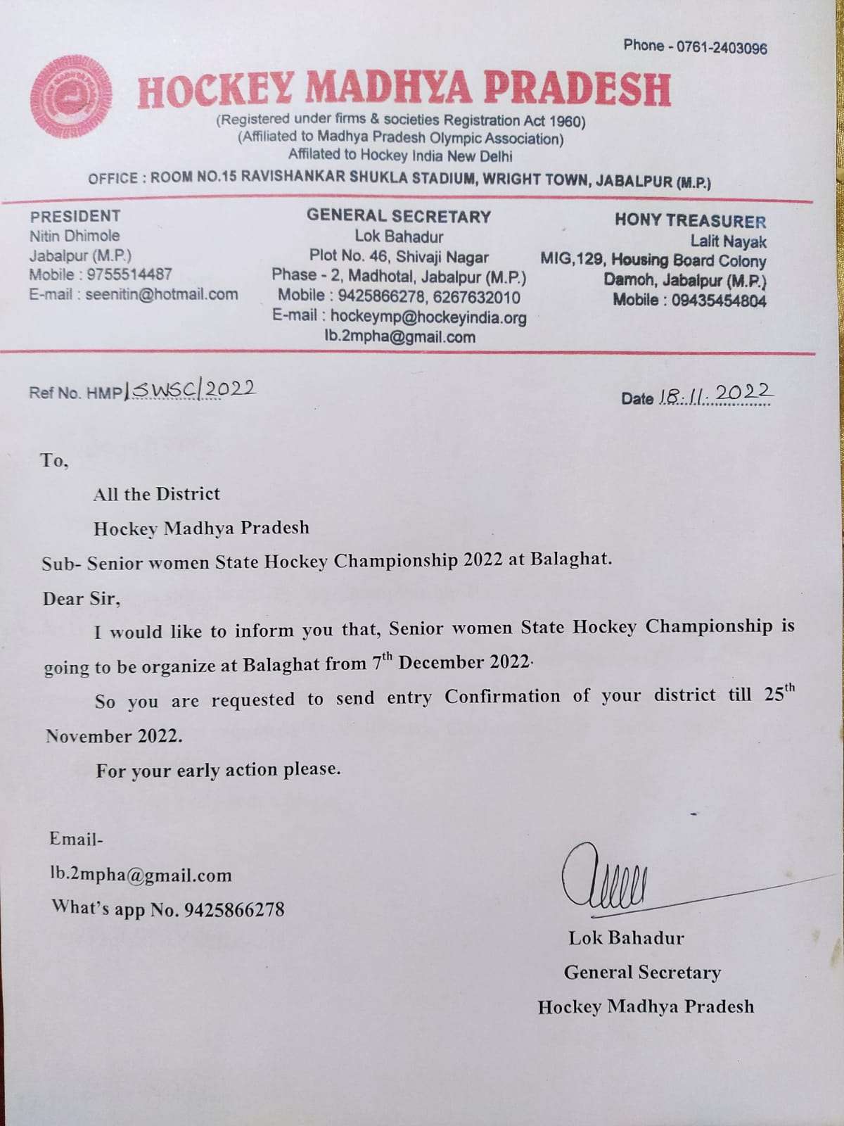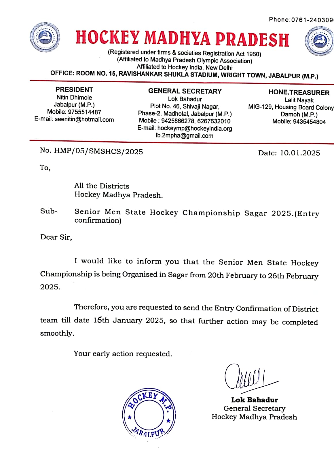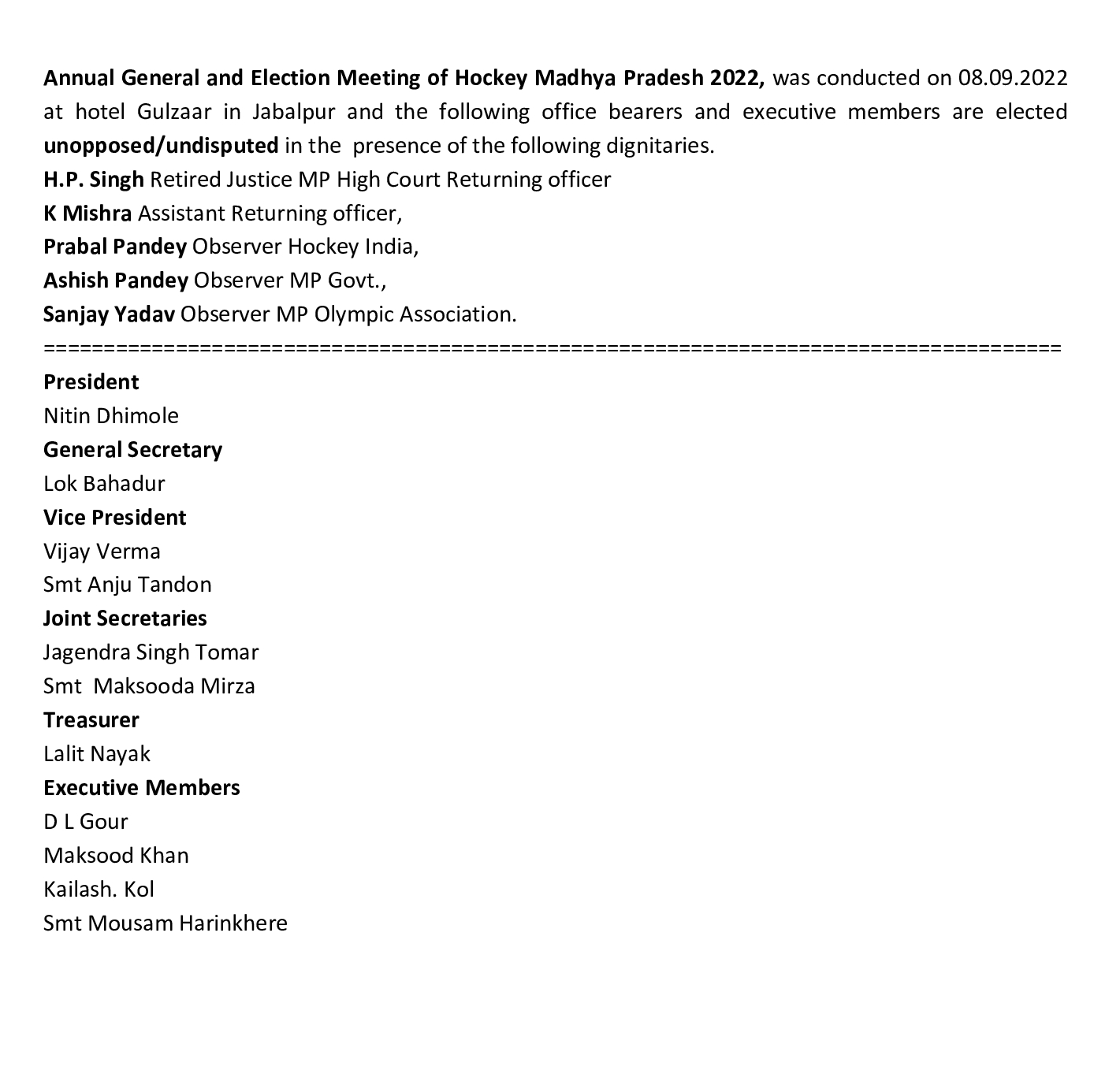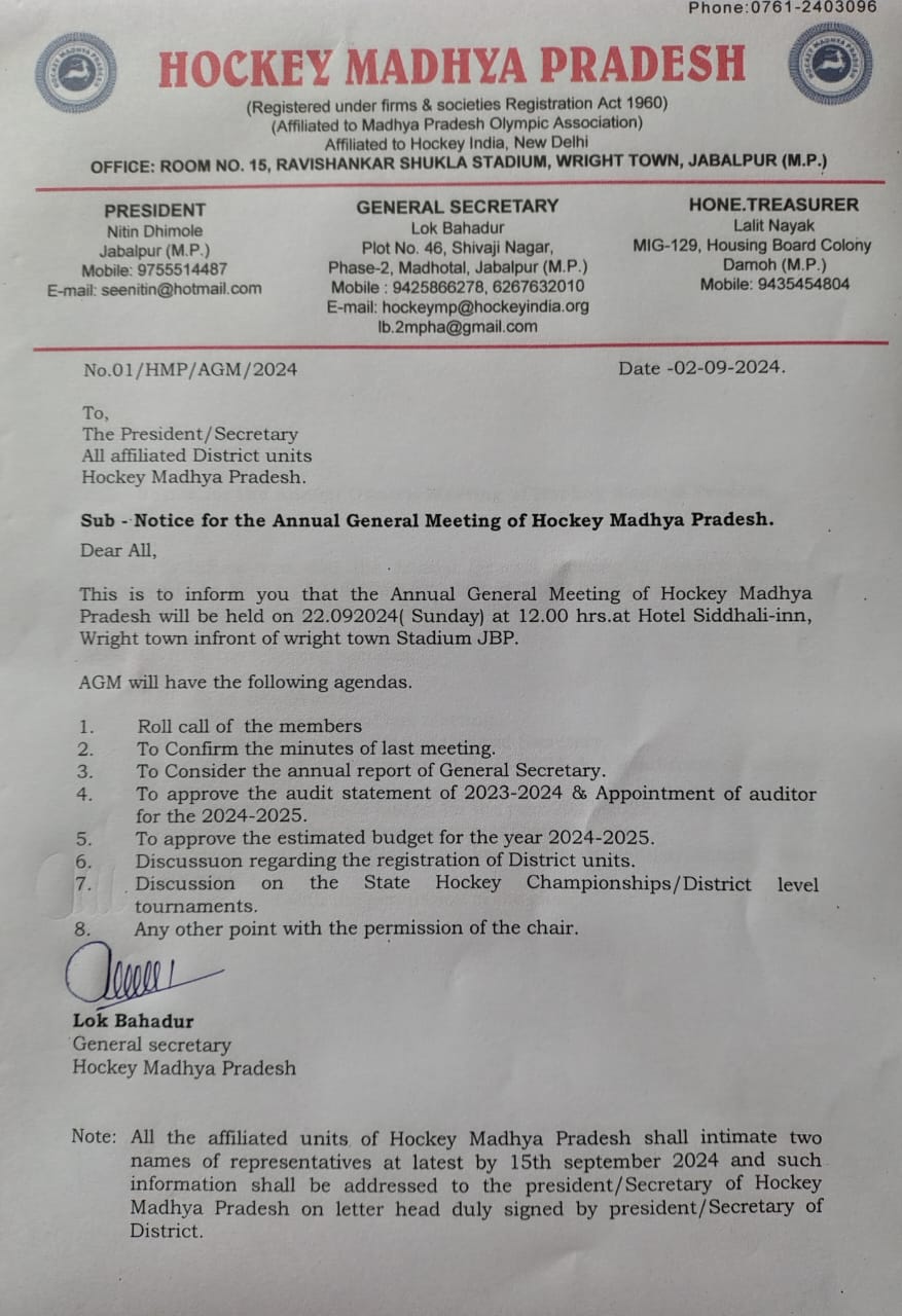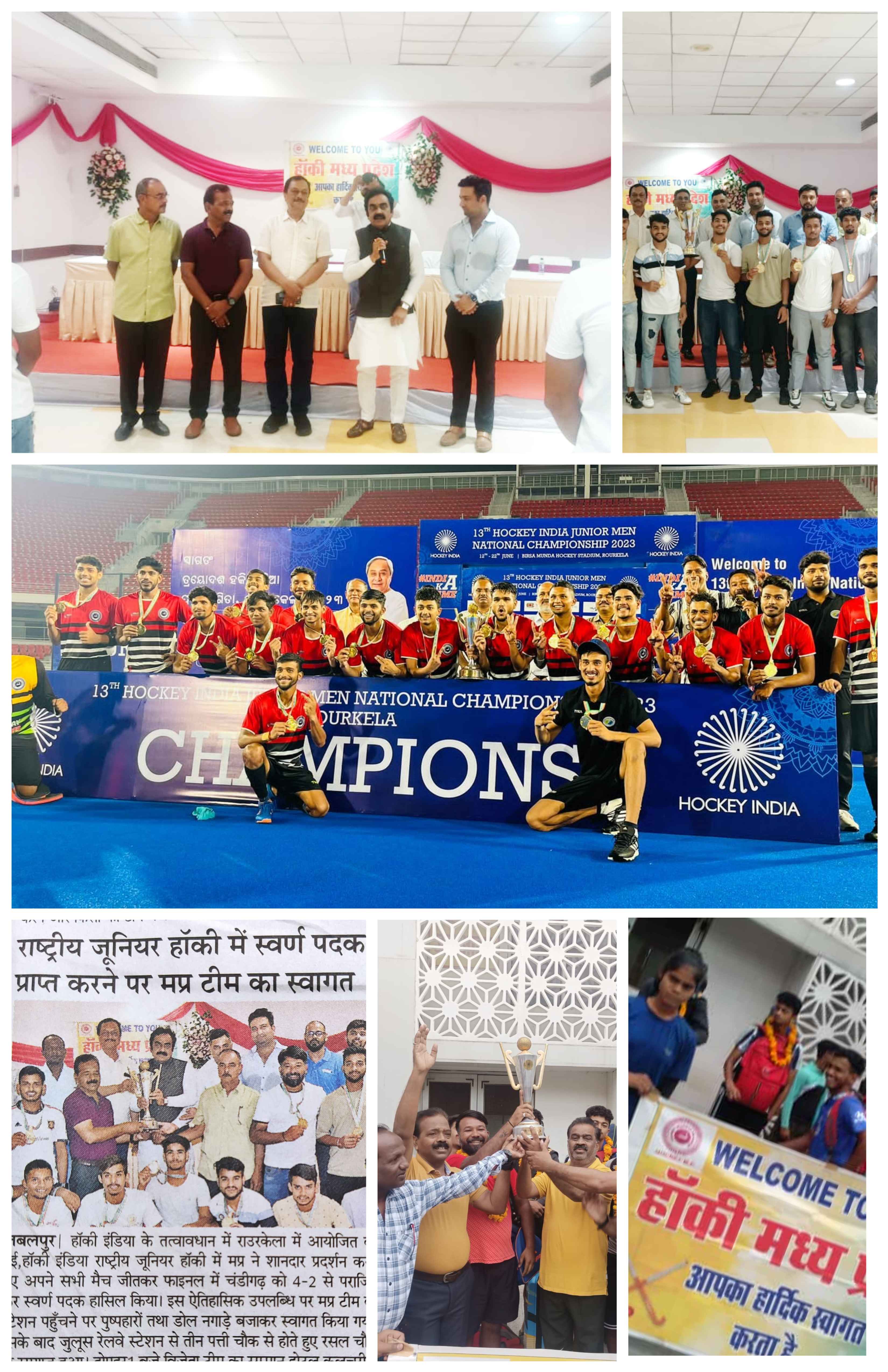 For above great victory of Hockey Madhya Pradesh team have received many congratulations by Smt Yashodhara Scindia Cabinet Minister MP Government,Mr.Jayant Malaiya Ex Cabinet Minister MP Government ,Mr.Lakhan Ghanghoria Ex Cabinet Minister MP Government,Mr.Ravi Gupta Director sports and youth welfare MP Government, Ajay Tandon MLA, Dr.Ajay Lal,Mr.Digvijay Singh Secretary MPOA,Dr.Avinash Sidhu,Lok Bahadur General Secretary Hockey Madhya Pradesh , Vijay Verma D LGour, Lalit Nayak Treasurer,Jagendra Singh, Prashant Mishra,Suresh Mehta,Shiv Das Verma, Arun Singh Kiledar,Arun Yadav, Ravi Shukla,DS Bharti, Paramjeet Singh, Vandana Uikey, Raina Yadav, Saroj Singh Rajput,Rajesh Saloman, Praveen Kumar Yadav, Mainuddin,and others.