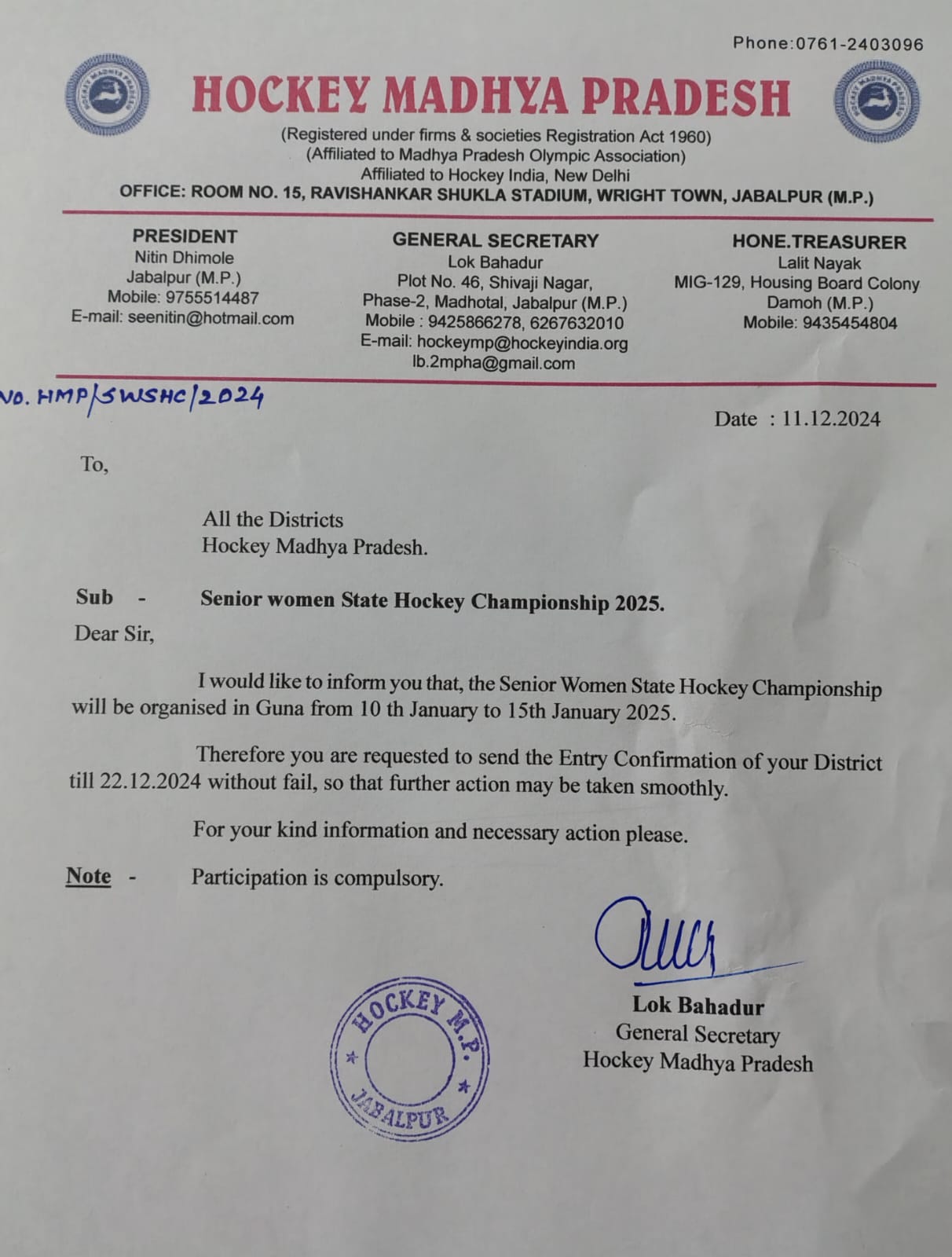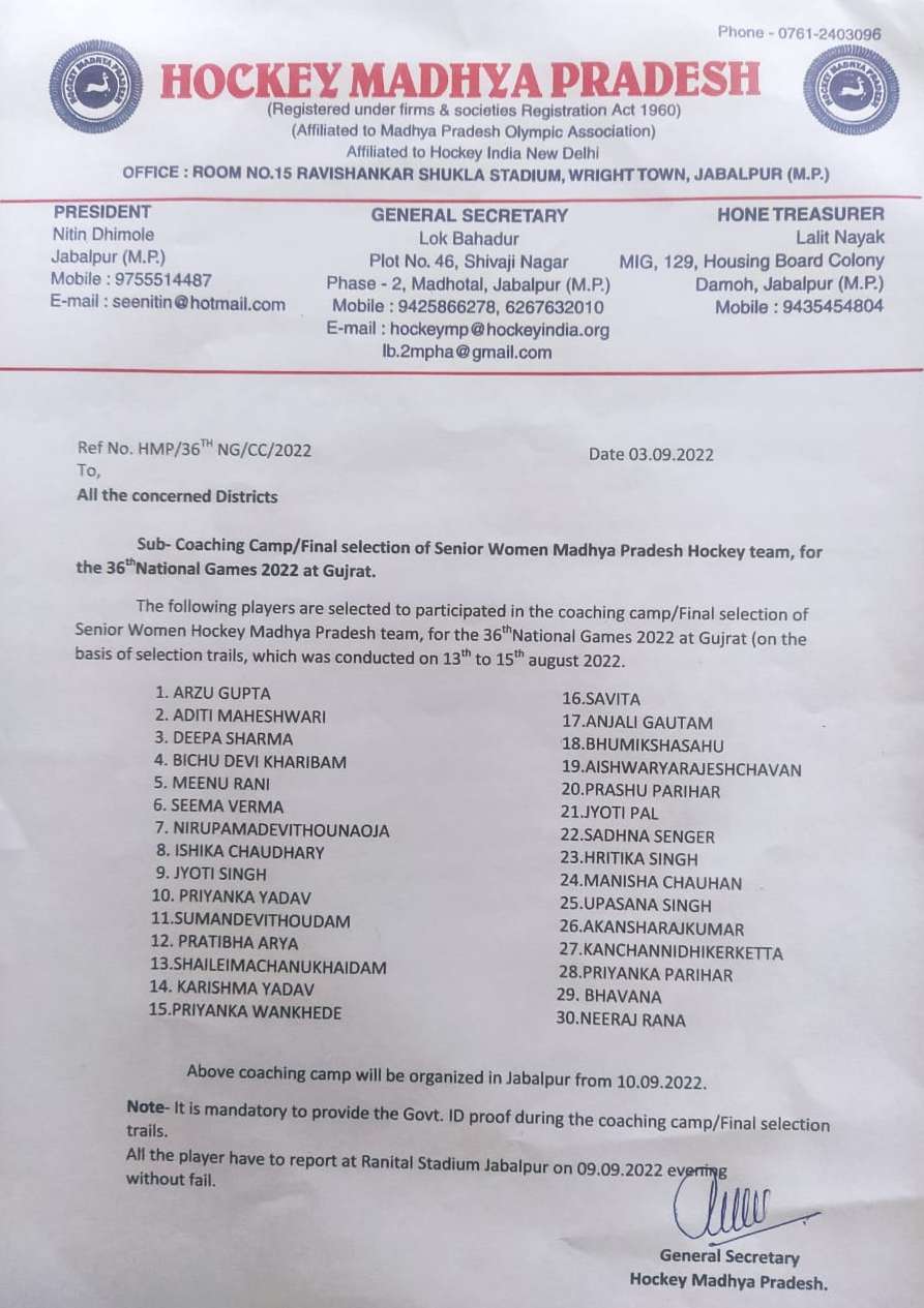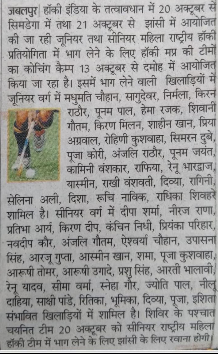 Coaching camp of Senior Women and Junior Women Hockey Madhya Pradesh Teams have been successfully completed at Damoh from 13 Oct'21 to 18 Oct'21 in the presence of Mr.Jayant Malaiya Ex Cabinet Minister MP, Govt,Patron Hockey Madhya Pradesh Mr.Ajay Tandon MLA , Vice President Hockey Madhya Pradesh, Dr Ajay Lal Director Aadharshila Institute Damoh, Lok Bahadur General Secretary Hockey Madhya Pradesh ,Lalit Nayak Treasurer, Jagendra Singh Tomar Joint Secretary Hockey Madhya Pradesh and others.In this occasion Mr Jayant Malaiya Ex Cabinet Minister MP,Mr.Ajay Tandon MLA,Dr.Ajay Lal were Honoured by Lok Bahadur General Secretary Hockey Madhya Pradesh and track shoots were provided to all the players.Miss Vandana Uikey Coach, Praveen Kumar Yadav, Miss Raina Yadav Coach, Miss Saroj Singh Rajput coach also were honoured by the chief guest