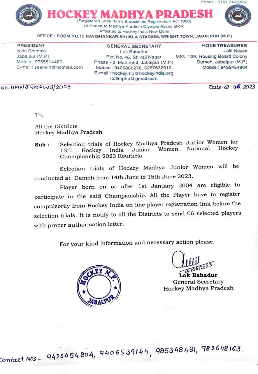 Selection trials of Junior Men Hockey Madhya Pradesh team has been Successfully organized in Betul from 19/9/2021 to 21/9/2021 with the Support of Mr.Arun singh Kiledar-Vice president, Mr.Jagendra Singh Tomar- Secretary,Hockey Betul and all officials of Hockey Betul in the presence of Selection committee Hockey Madhya Pradesh.During this trials players were selected for the coaching camp and final selection of Hockey Madhya Pradesh team was done.