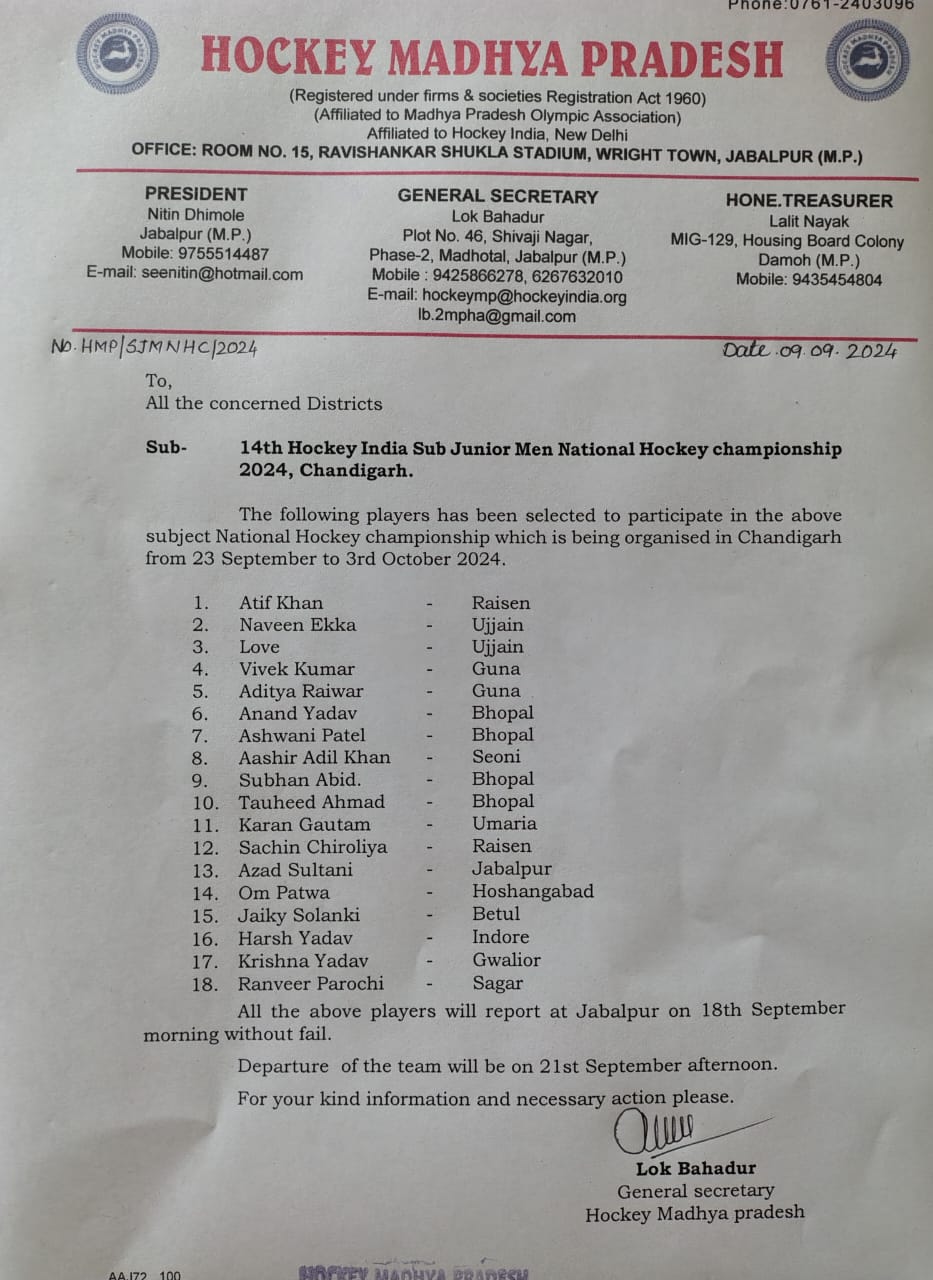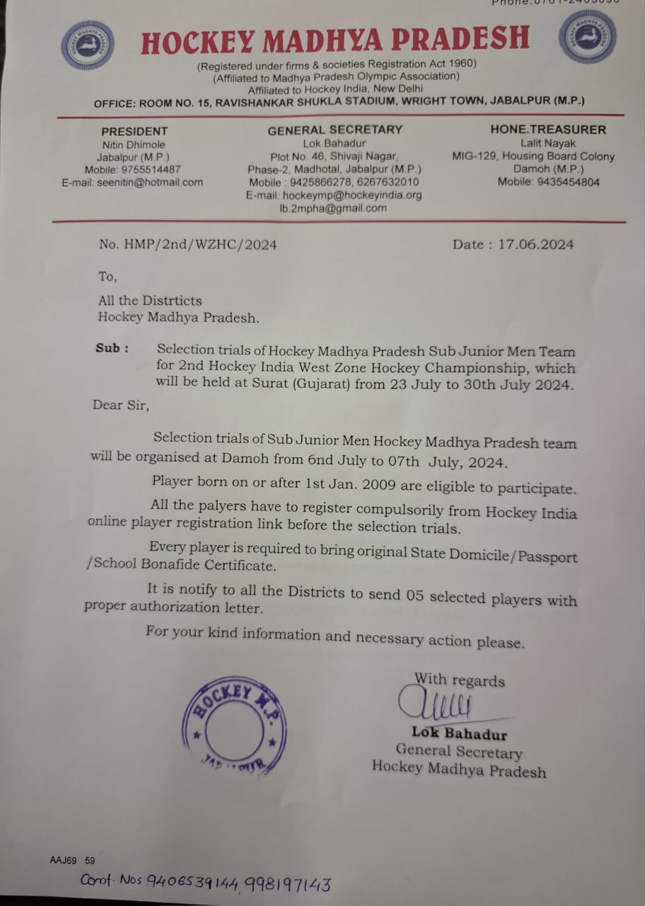 Sub Junior Men Hockey MP team selection and Coaching Camp 2021